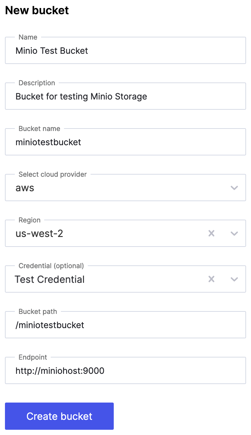 Add the information you collected above. Make sure you set the cloud provider to "aws." The Region field is not needed for MinIO, so leave it blank or set it to any value available.
