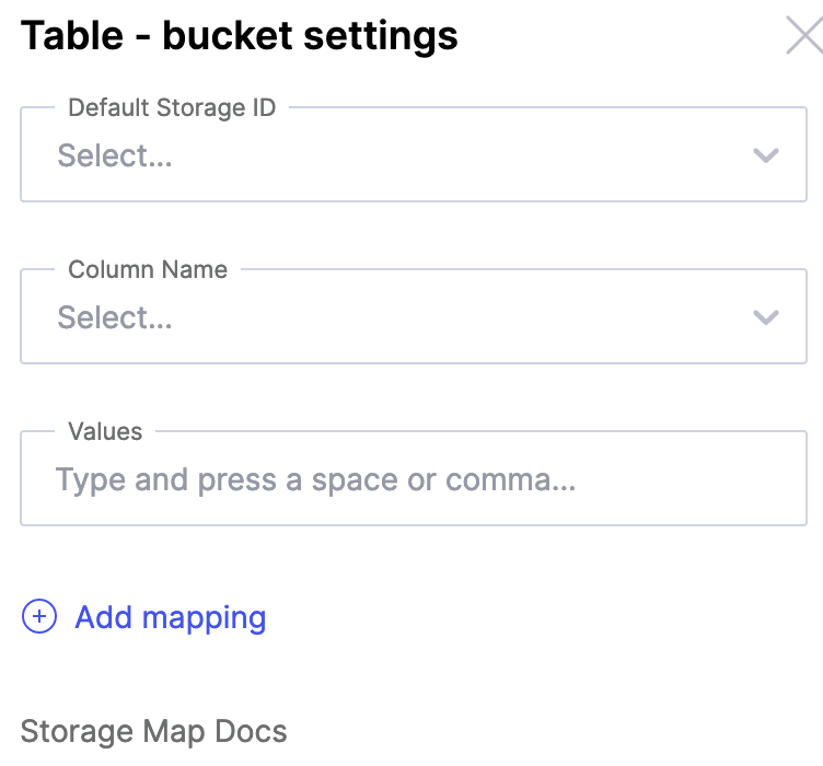Click "Data" and then select the table you would like to transition to your new bucket. Under "Advanced options," find "Bucket settings" and click the vertical menu icon to the right. Select "Edit" to bring you to the sidebar that lets you assign the Storage ID you created above.