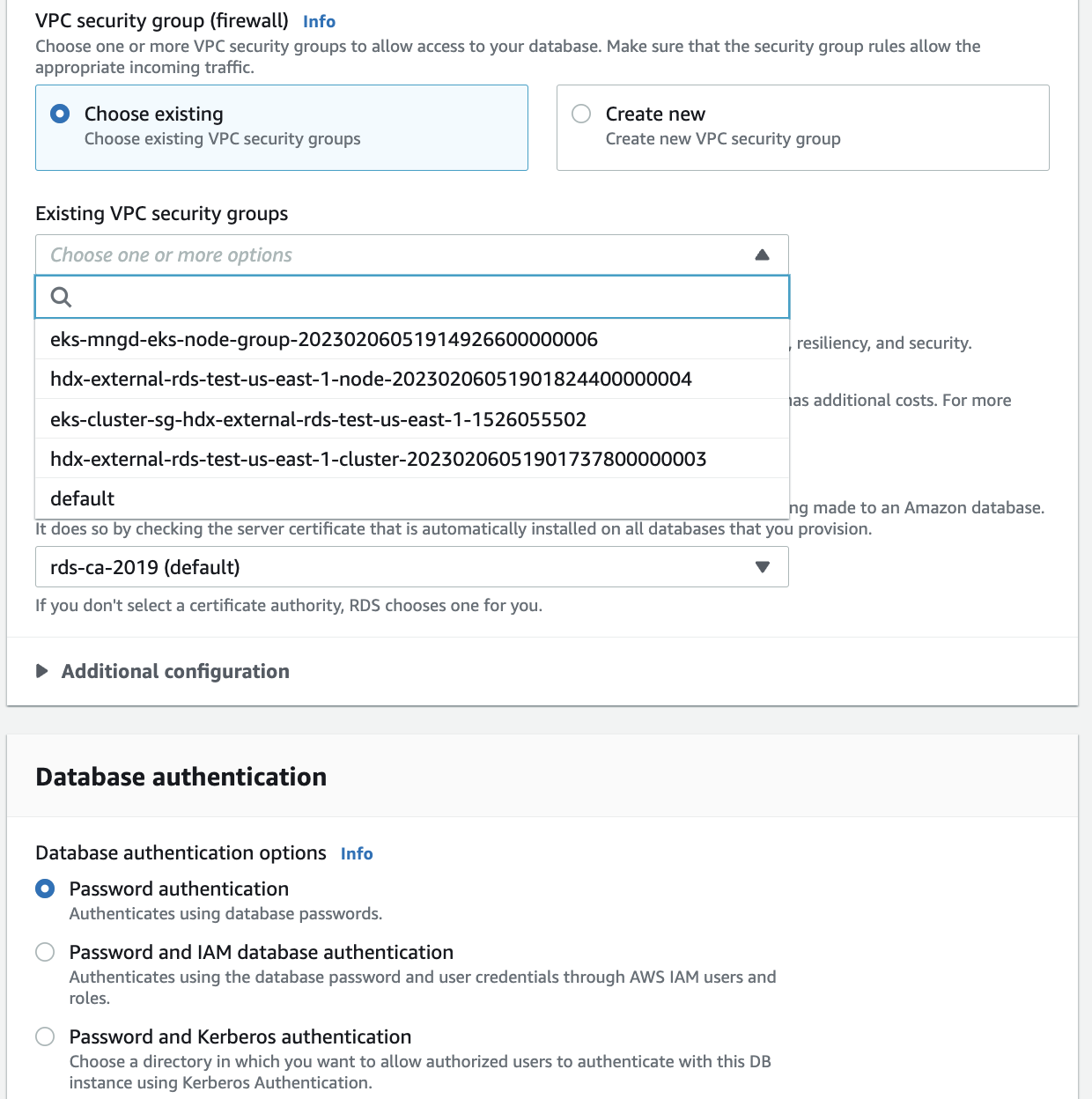 Existing VPC security groupsdropdown list. Use the default certificate authority and password authentication.